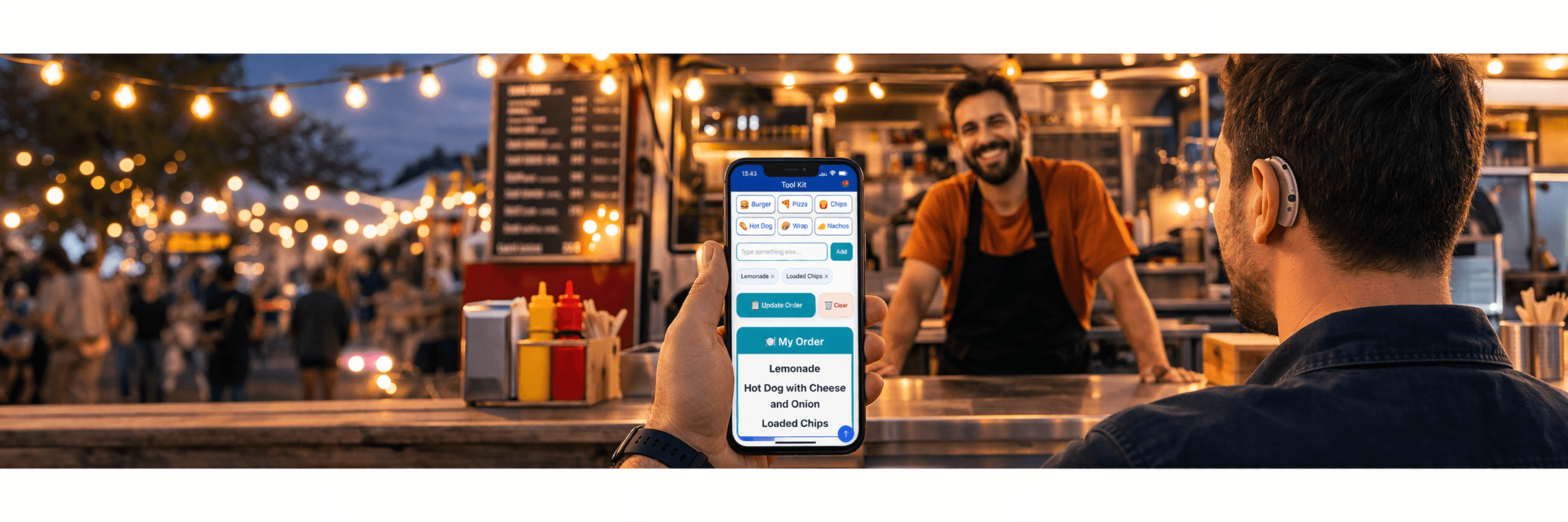 Pick items, set quantities, hand your phone over. No shouting, no repeating yourself. Works offline - useful at festivals with patchy signal.